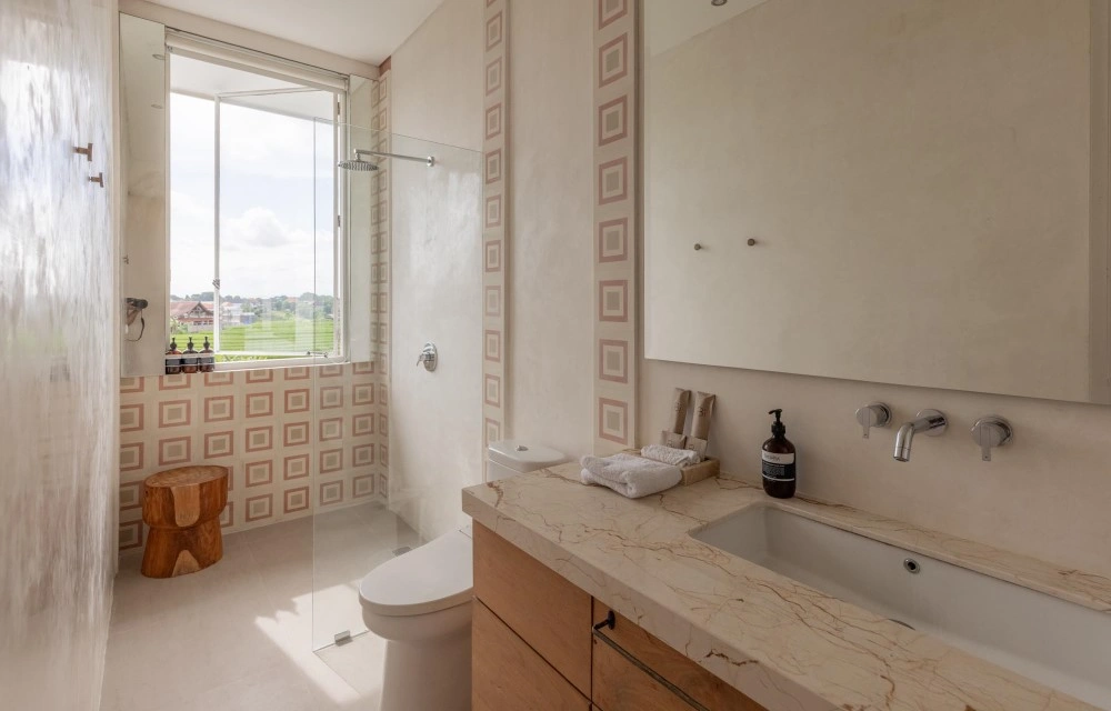 Discover the ultimate in relaxation at Bi Design House. Our Luna Suite offer a tranquil retreat. This room is equipped with contemporary décor, premium bedding and organic and sustainable mattresses by Heveya. Essential amenities such as complimentary Wi-Fi, dedicated workspace and walk in wardrobe. This room has rice field views and is on the first floor, accessed only by one set of stairs. This room can be made for a queen bed or twin beds. Please specify when your bedding preferences when booking. This room can accommodate a maximum of two adults.
